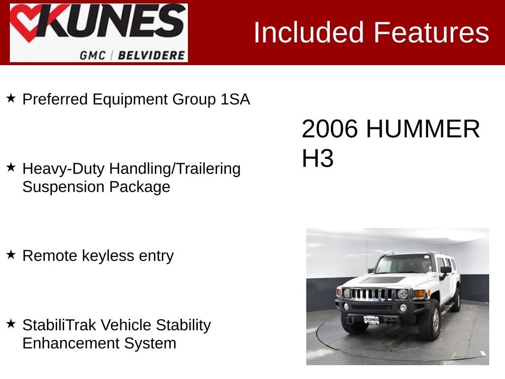 Certified. 2006 Hummer H3 Heavy-Duty Handling/Trailering Suspension Package, Preferred Equipment Group 1SA, Remote keyless entry, StabiliTrak Vehicle Stability Enhancement System. Birch White