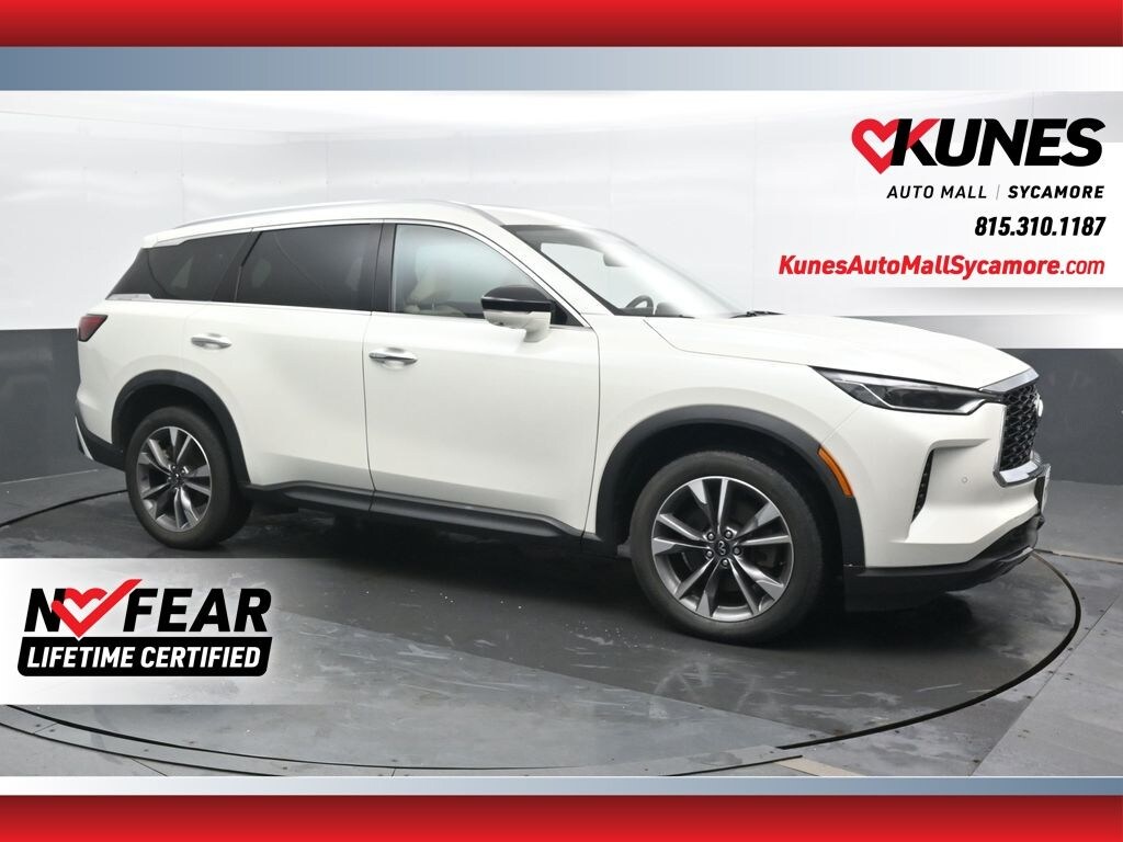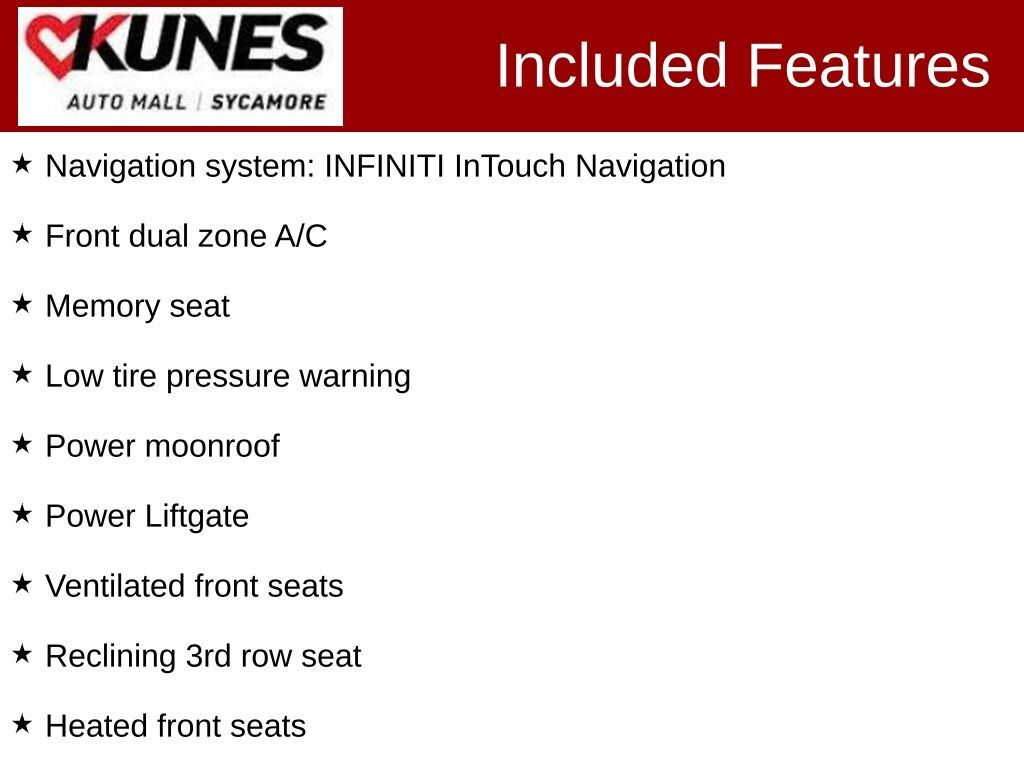 2023 INFINITI QX60 LUXE Front dual zone A/C, Heated front seats, Low tire pressure warning, Memory seat, Navigation system: INFINITI InTouch Navigation, Power Liftgate, Power moonroof, Rain sensing wipers, Reclining 3rd row seat, Ventilated front seats.