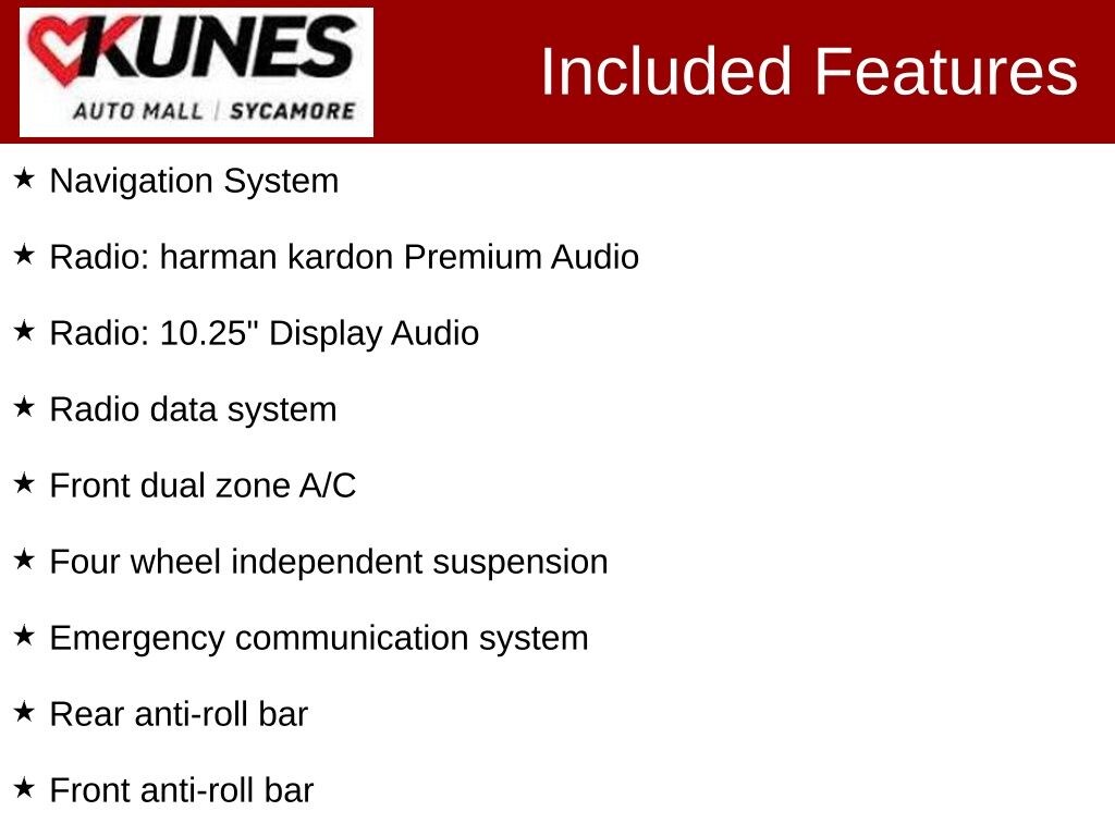 KUNES AUTO MALL OF SYCAMORE - Kunes Auto Group is dedicated to building peopleâs lives in the communities we serve. Weâre family-owned and operated. Gregg Kunes started with Kunes Ford Lincoln in Delavan, Wisconsin in 1996, and over the years we have grown to 40 automobile and RV dealerships throughout the Midwest. Our mission is to not only deliver exceptional customer service, but to serve our communities well in the form of projects, promotions, support, donations, and whatever else is needed. Find out why our dealerships have won DealerRater.com DEALER OF THE YEAR a whopping 10 TIMES! Call, email, or live chat with one of our friendly sales professionals now to schedule your test drive! Price excludes taxes, license and title fees and a $377.63 documentary service fee. While we make every effort to ensure the data listed here is correct, there may be instances where some of the options or vehicle features may be listed incorrectly as we get data from multiple data sources. PLEASE MAKE SURE to confirm the details of this vehicle with the dealer to ensure its accuracy. Dealer cannot be held liable for data that is listed incorrectly. Prices shown do not include taxes, license, and title fees and a $377.63 documentary service fee.