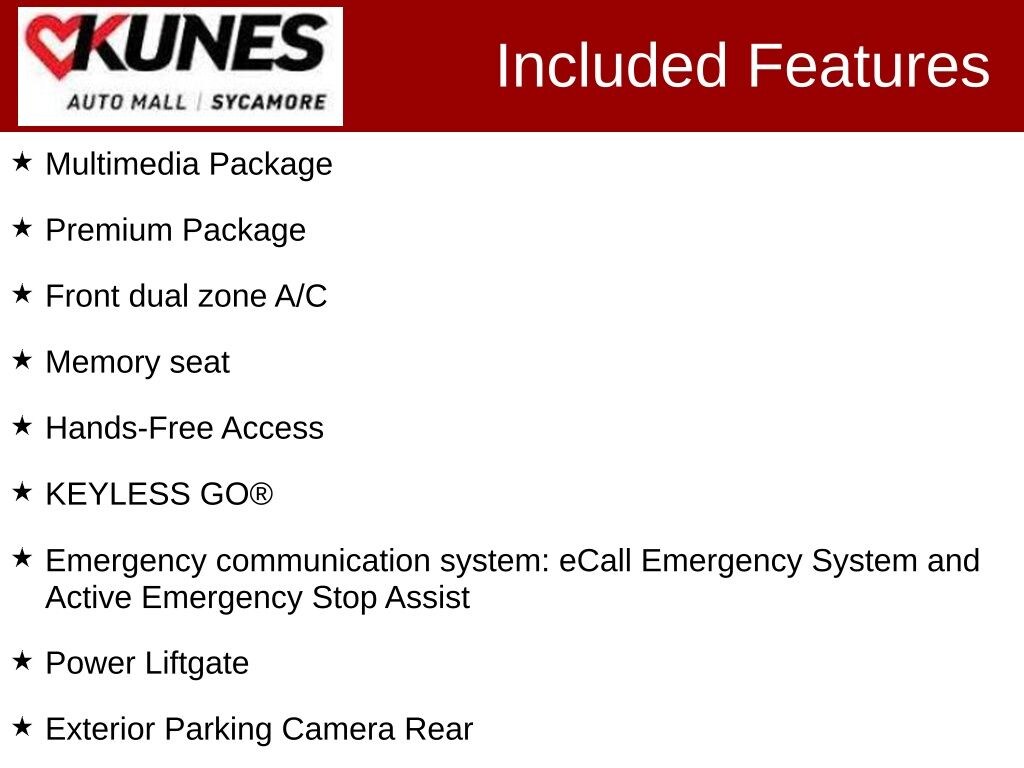KUNES AUTO MALL OF SYCAMORE - Kunes Auto Group is dedicated to building peopleâs lives in the communities we serve. Weâre family-owned and operated. Gregg Kunes started with Kunes Ford Lincoln in Delavan, Wisconsin in 1996, and over the years we have grown to 40 automobile and RV dealerships throughout the Midwest. Our mission is to not only deliver exceptional customer service, but to serve our communities well in the form of projects, promotions, support, donations, and whatever else is needed. Find out why our dealerships have won DealerRater.com DEALER OF THE YEAR a whopping 10 TIMES! Call, email, or live chat with one of our friendly sales professionals now to schedule your test drive! Price excludes taxes, license and title fees and a $377.63 documentary service fee. While we make every effort to ensure the data listed here is correct, there may be instances where some of the options or vehicle features may be listed incorrectly as we get data from multiple data sources. PLEASE MAKE SURE to confirm the details of this vehicle with the dealer to ensure its accuracy. Dealer cannot be held liable for data that is listed incorrectly. Prices shown do not include taxes, license, and title fees and a $377.63 documentary service fee.